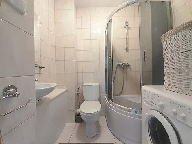 Łazienka z WC: kabina prysznicowa, umywalka, szafka, lustro, pralka.